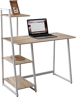 DlandHome Computertisch klein Schreibtisch mit Regal 100cm Holz schreibtisch mit ablagefächer Laptop PC Tisch, Bürotisch Schreibtisch mit ablage Arbeitstisch für Zuhause Arbeitszimmer/Büro Eiche/Weiß